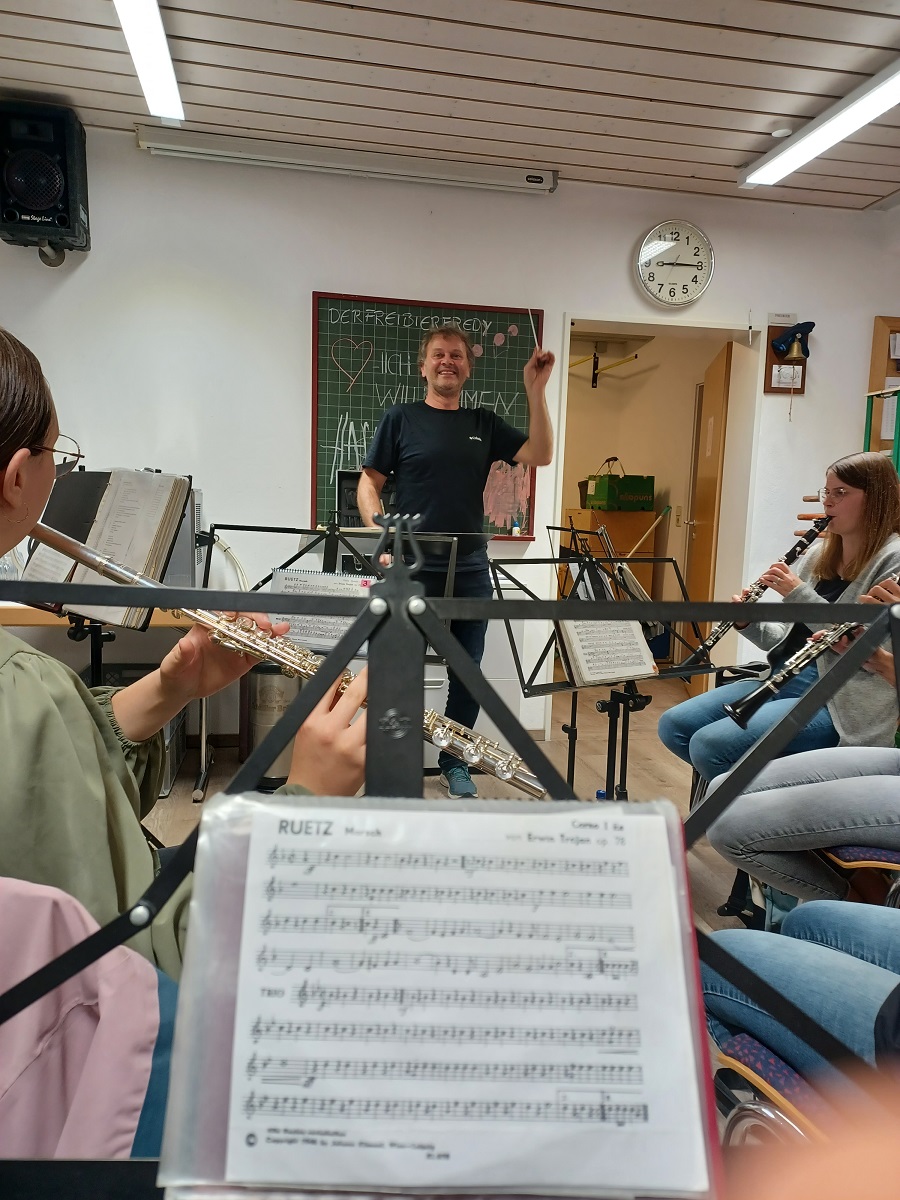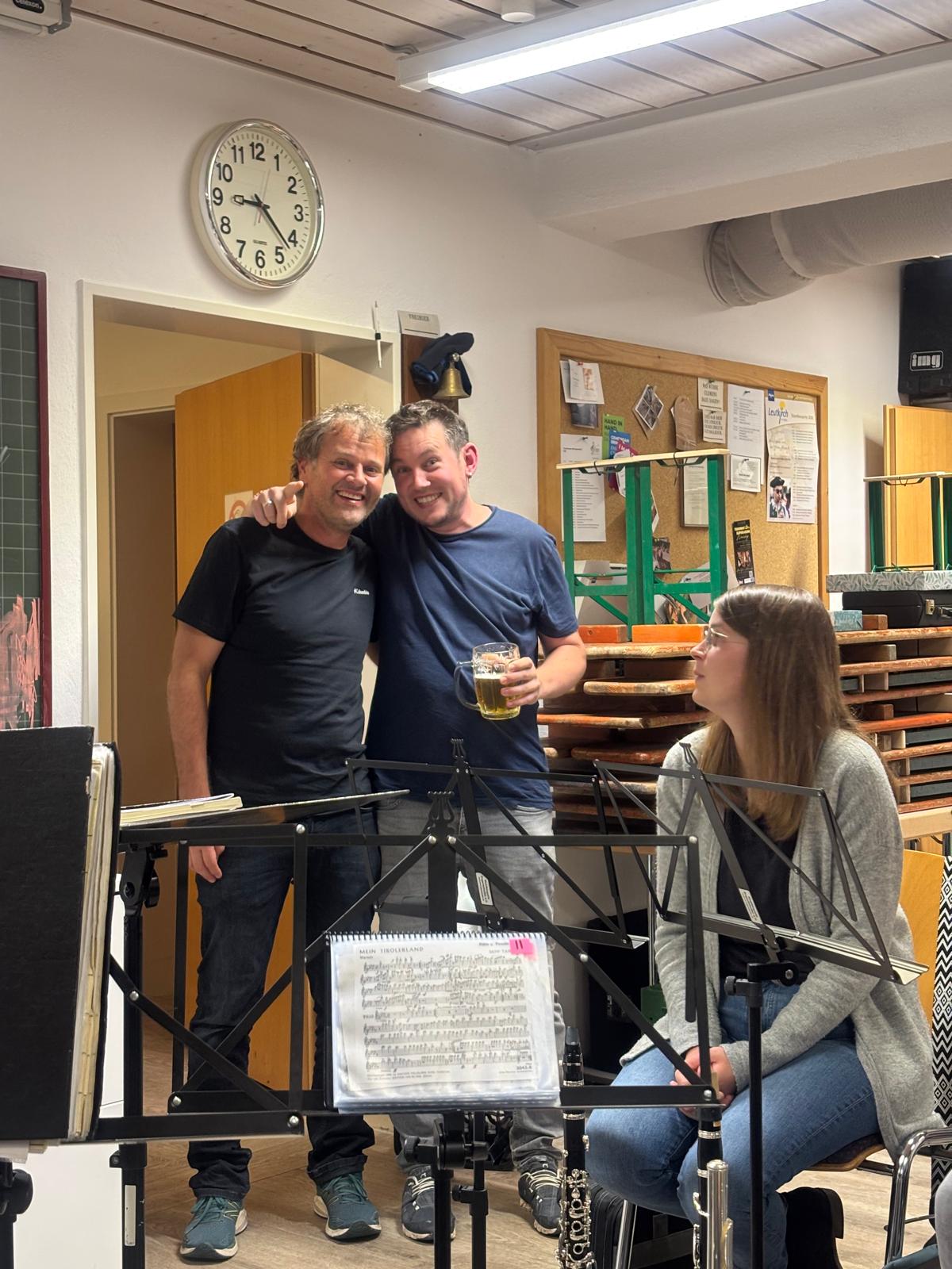 Nach einer kurzen Musikprobe wurden wir von Rainer mit einem reichhaltigen Vesper, Fassbier, sowie vielen weiteren Leckereien verköstigt. Natürlich überbrachten wir ihm auch ein Ständchen, dass er dirigieren durfte. Auch unser Dirigent Johannes hatte einen Grund zu feiern, denn er hatte an diesem Tag tatsächlich Geburtstag.