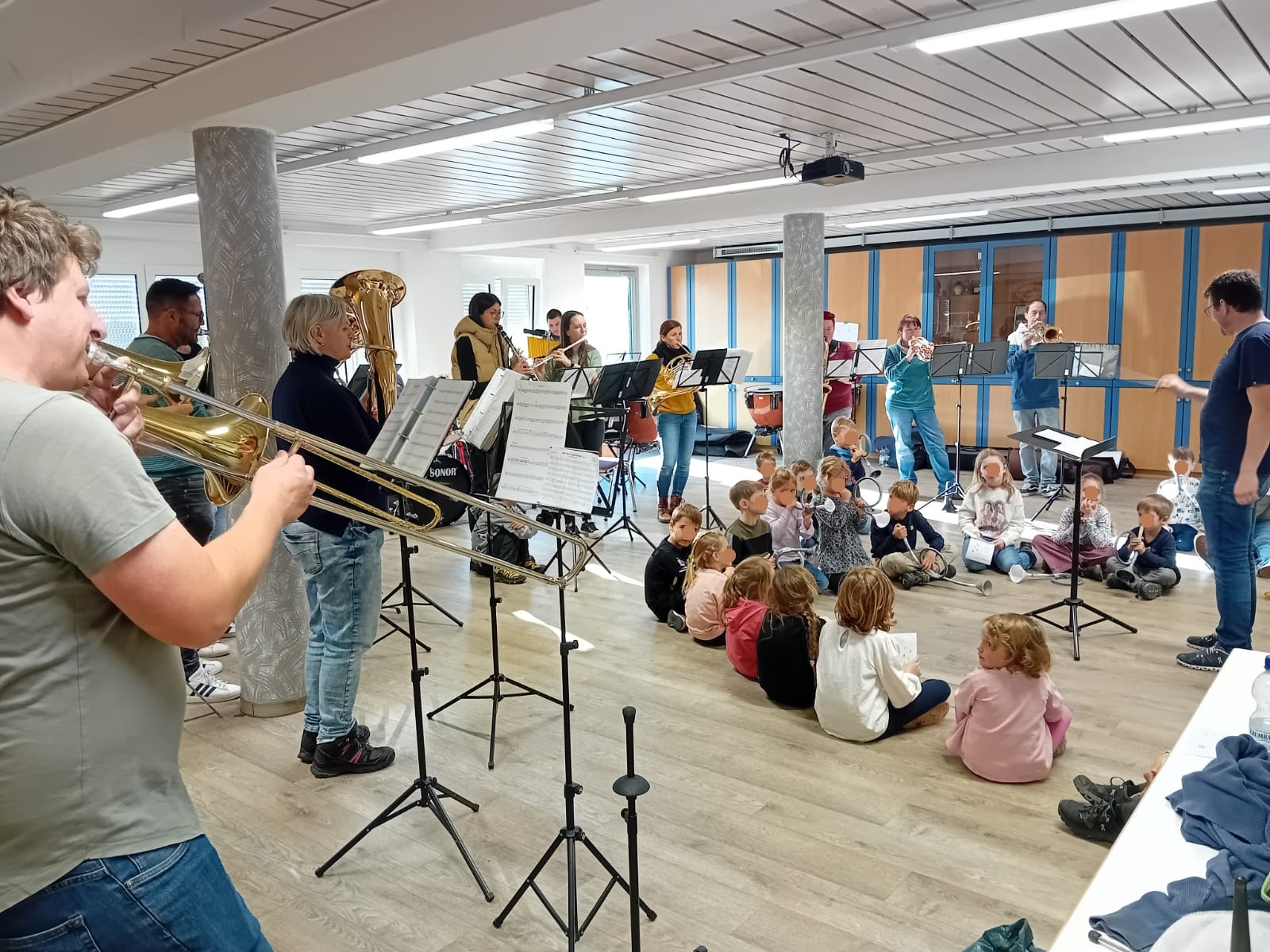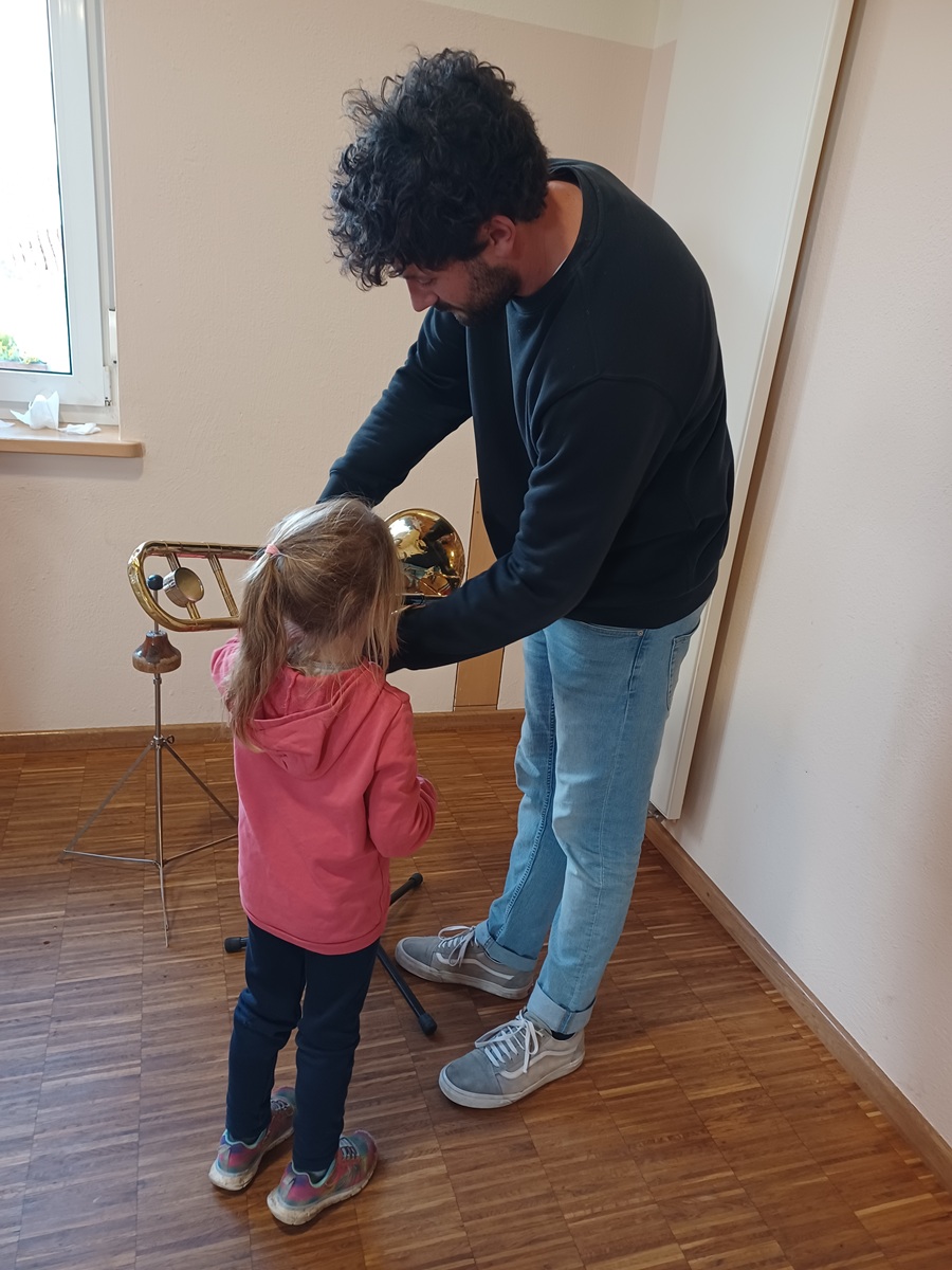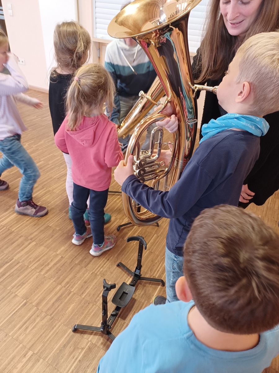 An vier Stationen durften sich die Kinder zuerst einen Film über die verschiedenen Instrumente anschauen und anschließend natürlich auch selber ausprobieren. Am Ende des Nachmittages spielten wir den Kindern zwei Stücke vor und sie durften auf ihrer Schlauchtrompete mitspielen, klatschen oder tanzen.